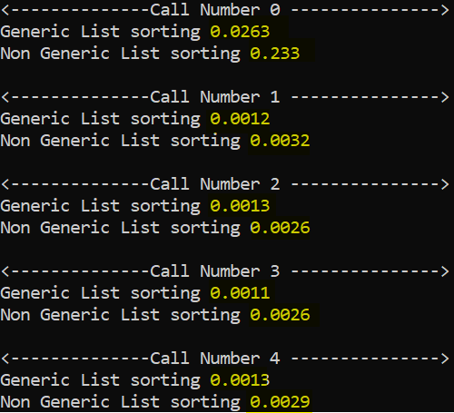 Console.WriteLine("Non Generic List sorting " + stWatch.Elapsed.TotalMilliseconds.ToString());