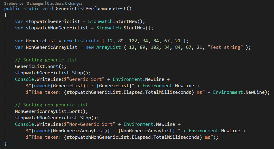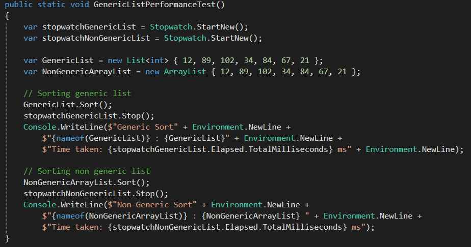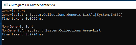 - $"Time taken: {stopwatchNonGenericList.Elapsed.TotalMilliseconds} ms");