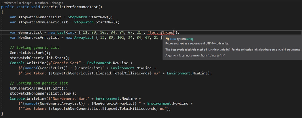 Let’s update the above code, Add a new string in GenericList, we can see a compile time error occurs for invalid type.