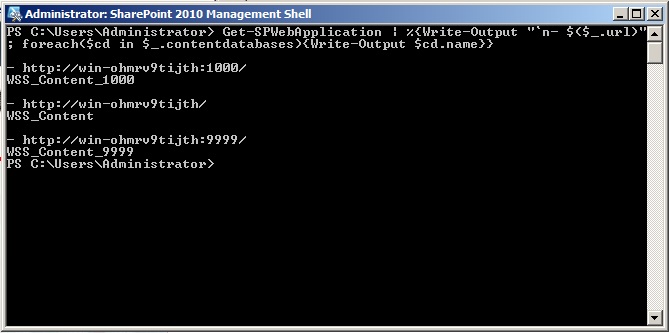 - Get-SPWebApplication | %{Write-Output "`n- $($_.url)"; foreach($cd in $_.contentdatabases){Write-Output $cd.name}}
