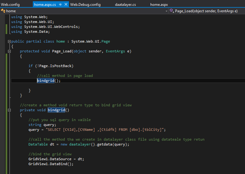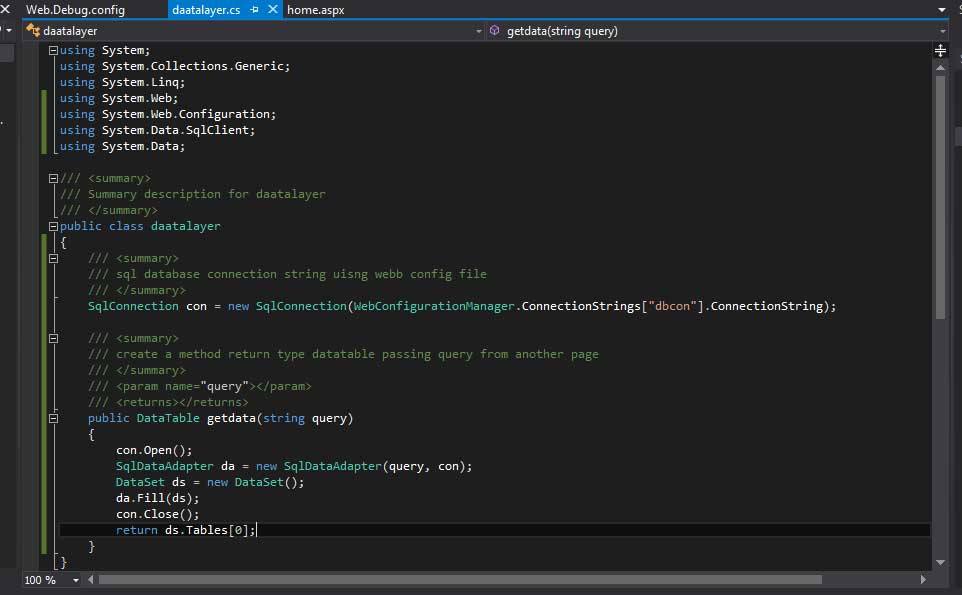 Step 7: Create a data table return type method using a parameter of SQL query.