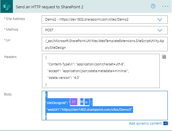 "webUrl":"https://dev1802.sharepoint.com/sites/Demo3" // Site where you want to apply site template