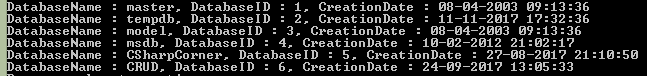 - Console.WriteLine("DatabaseName : " + databaseName + ", DatabaseID : " + dbID + ", CreationDate : " + creationDate);