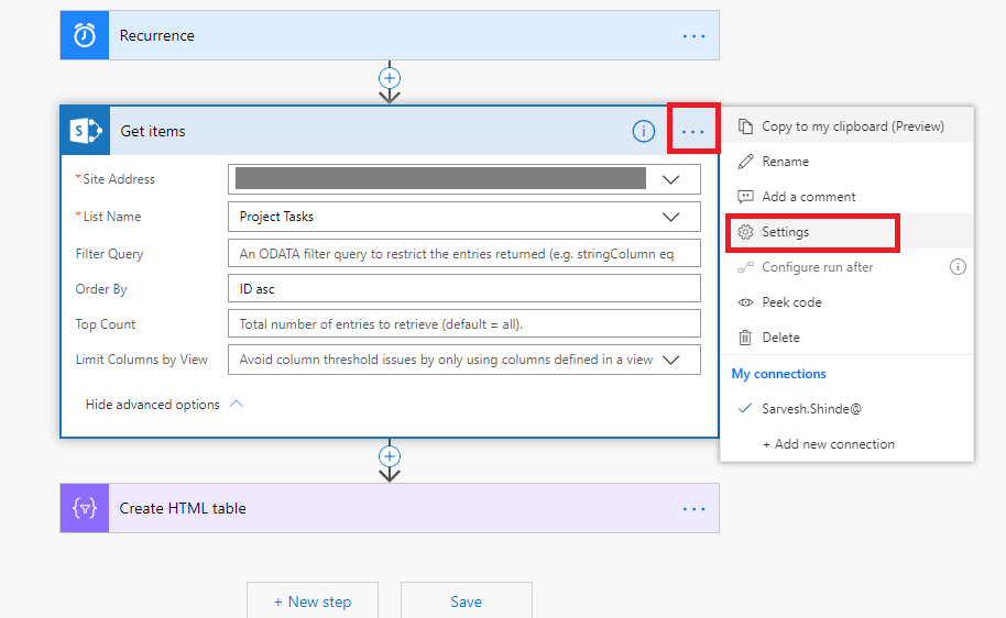 Go back to your FLOW in edit mode. Select Get Items action >> From more Menu options, click on Settings
