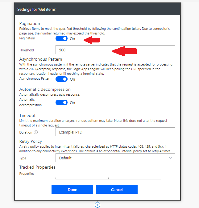 The first option is the Pagination. We need to enable it so that connectors know that it needs to paginate until the threshold is reached.