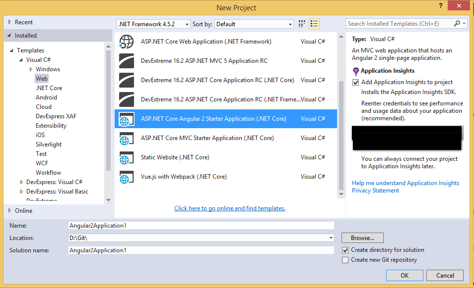 Select ASP.NET Core Angular 2 Starter Application (.NET Core) and fill appropriate details.