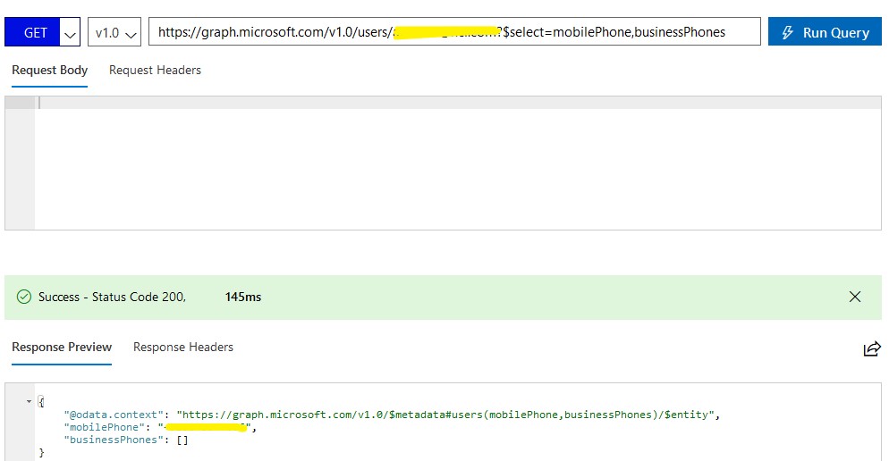 Microsoft Graph API only fetches if the user has stored his/her number in the organization's directory.