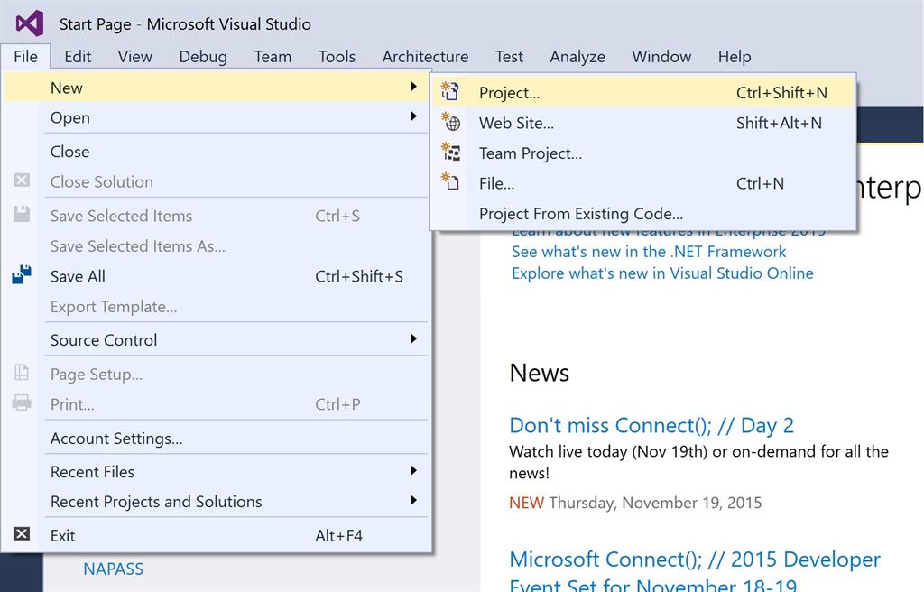 - Once visual studio started Select File, Then New, Then Project from Menu.