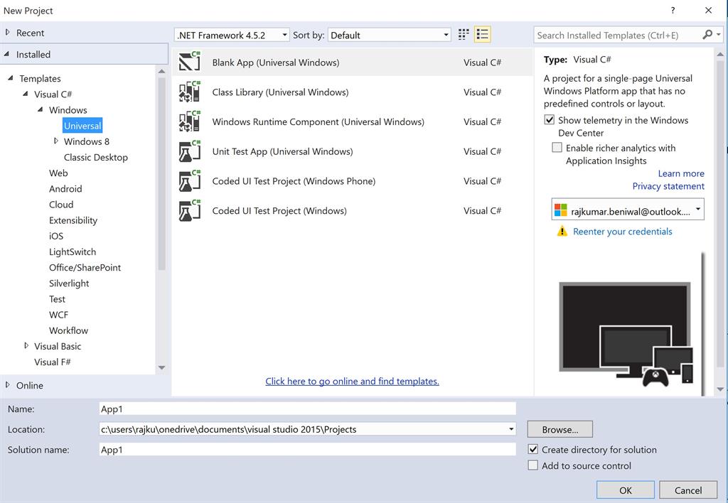 S3. Select Visual C# from installed templates, then select Windows, Select Universal then select Blank App.