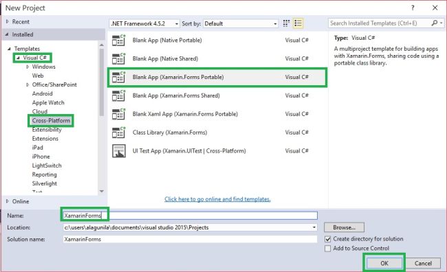 New Project Window will open. You can select an Installed -> Template -> C# -> Cross-Platform Cordova apps -> Blank App (Xamarin.Forms Portable).