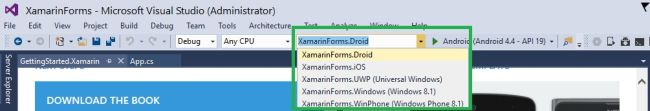 We can also run our app in Android, iOS and Windows device emulators. To see them all, choose any platform from the platform list on the Standard toolbar.