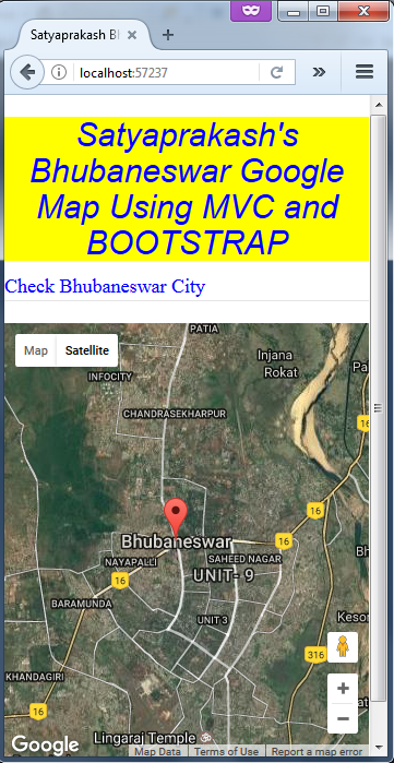 - <h2 style="background-color: Yellow;color: Blue; text-align: center; font-style: oblique">Satyaprakash's Bhubaneswar Google Map Using MVC and BOOTSTRAP</h2>