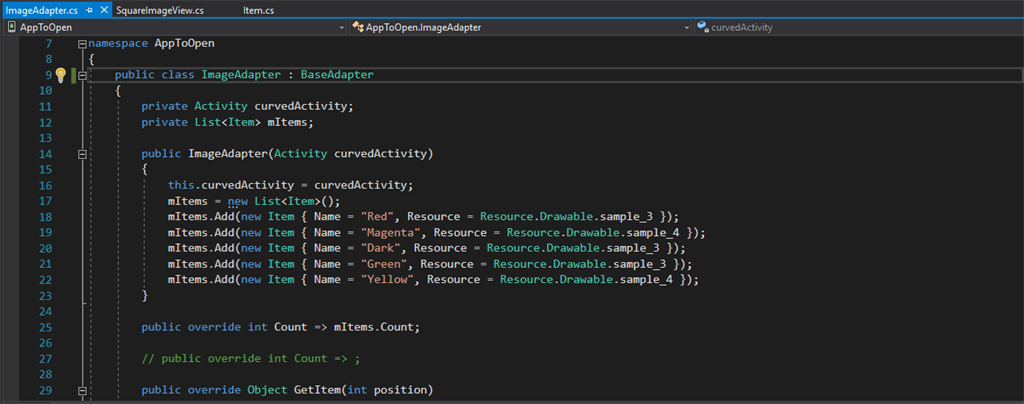 Now create an adapter ImageAdapter class for gridview created in Main.axml. This ImageAdapter inflates griditem.axml and returns the view.