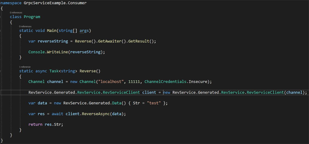 Let's follow the below steps to create a simple gRPC service in C#. This service will have a simple method called “Reverse” which will take one string parameter and return reverse of that string. This example contains a proto file also. I would recommend you to please go through this post if you don’t know about protobuf. This example is divided into two parts: 1. Service and 2. Consumer. Service implementation