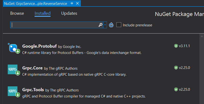 3. In services, add these NuGet packages. All these packages help us in compiling proto files and generating boilerplate code for us.