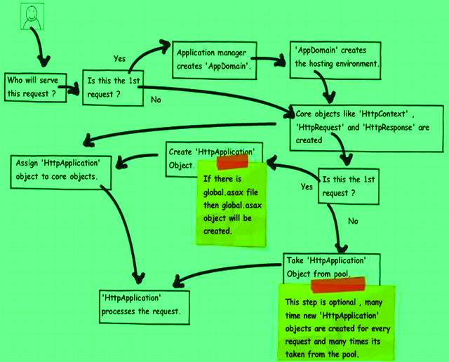 - First request goes to the web server and it will check which ISAPI extension is requesting to server. In the case of .aspx, request goes to aspnet_isapi.dll for processing our application.