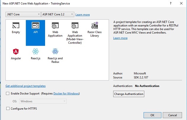 1. Open VS, go to File > New and select Project > ASP .NET Core Web Application. Select the solution name (e.g. Training service) and the location of your local directory. Click ok.