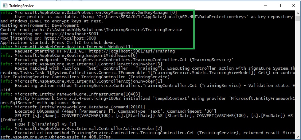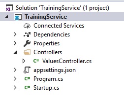 6. Next, you can use the internal services/helper concept to read/validate the data when service requests for it. I have created ITrainingServices interface and corresponding service class TrainingServices which use database context to manage the data. Using this approach, you can also create one local service (LocalTrainingServices) which is independent of db context, and keeps values in memory for testing. If you have not established entity framework yet in that case you can use this local service as Scope in startup.cs. Replace AddScoped<> line in startup.cs with below code.