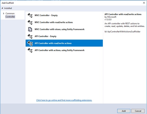 2. Select the API for creating REST API using default example valuecontroller(can be deleted later). You can uncheck the 'Configure for HTTPS' checkbox because that creates SSL-based project and you have to use HTTPS instead of HTTP in your URLs (this is an optional step).