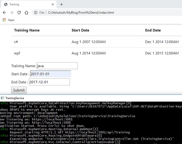 I will be creating a Training Service as an example in my complete course to demonstrate Web Service, Entity Framework, and a few front-end concepts. The front-end will provide a UI to list all the training details in table form using REST API and another form with input fields as name, start date, end date, and confirm Submit button. On confirmation, the REST API should save the new training details into the database.