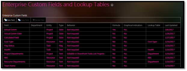 Select PWA Settings >> Enterprise Data >> Enterprise Custom Fields and Lookup Tables.