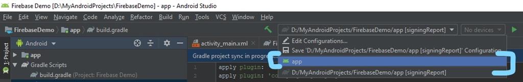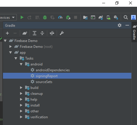 Add Debug signing certificate SHA-1. This also is optional but required for Dynamics Links, App invites and Google sign-in and phone number support in Auth. To add this, go to Gradle->your app name->app->Tasks->android->signingReport.