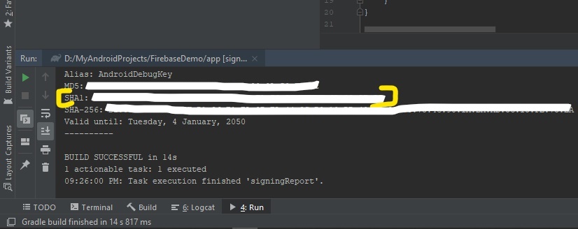 After executing the signing report, get your Debug signing certificate SHA-1 displayed as SHA-1.