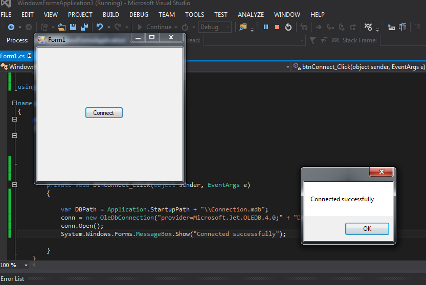 Now on button click event connect with MS Access: