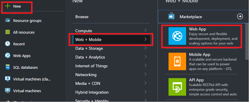 - Click on New, Web + Mobile, then Web App. Here's the screenshot: