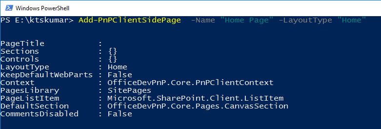 - PS:> Add-PnPClientSidePage -Name “Home Page” -LayoutType Home