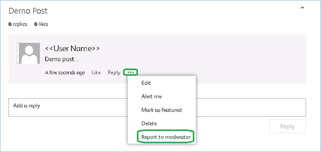 - Once we enable this setting, Report to moderator option will start showing in discussion posts.
