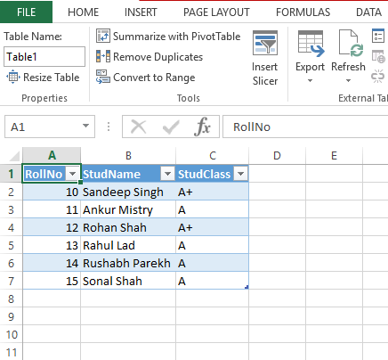 If you note here all your tag like '<RollNo>' or '<StudentName>' became Headers in Excel Spreadsheet.