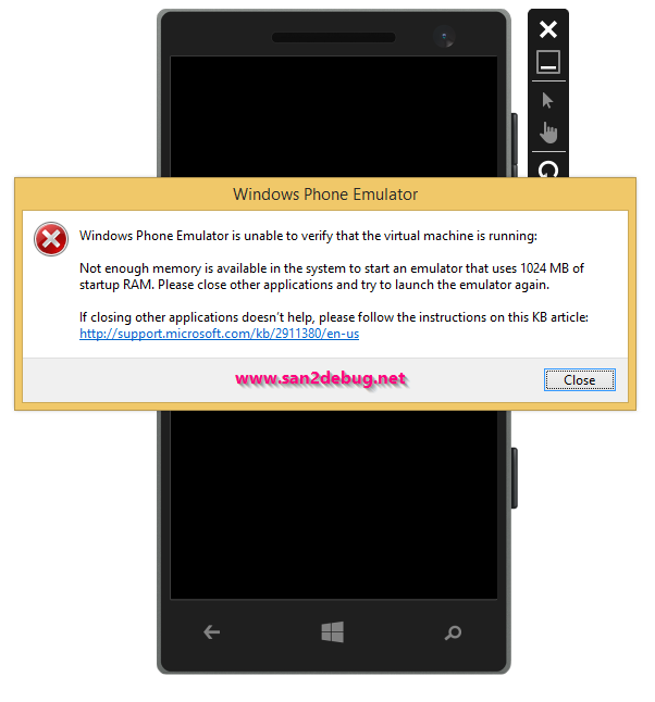 Windows Phone Emulator is unable to verify that the virtual machine is running: Not enough memory is available in the system to start an emulator that uses 1024 MB of startup RAM. Please close other application and try to launch the emulator again. If closing other applications doesn’t help, please follow the instruction on this KB article.