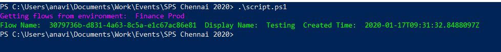 - write-host -ForegroundColor Green "Flow Name: " $flow.FlowName " Display Name: " $flow.DisplayName " Created Time: " $flow.CreatedTime