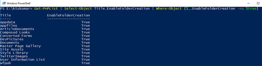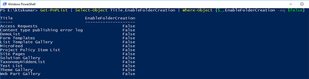 - PS:> Get-PnPList | Select-Object Title,EnableFolderCreation | Where-Object {_.EnableFolderCreation -Eq $true }