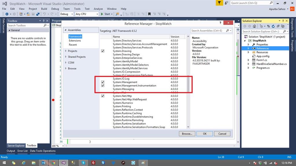 Step 1: Creat a Project =>Right click on references, then Add System.Management, System.Management.Instrument.