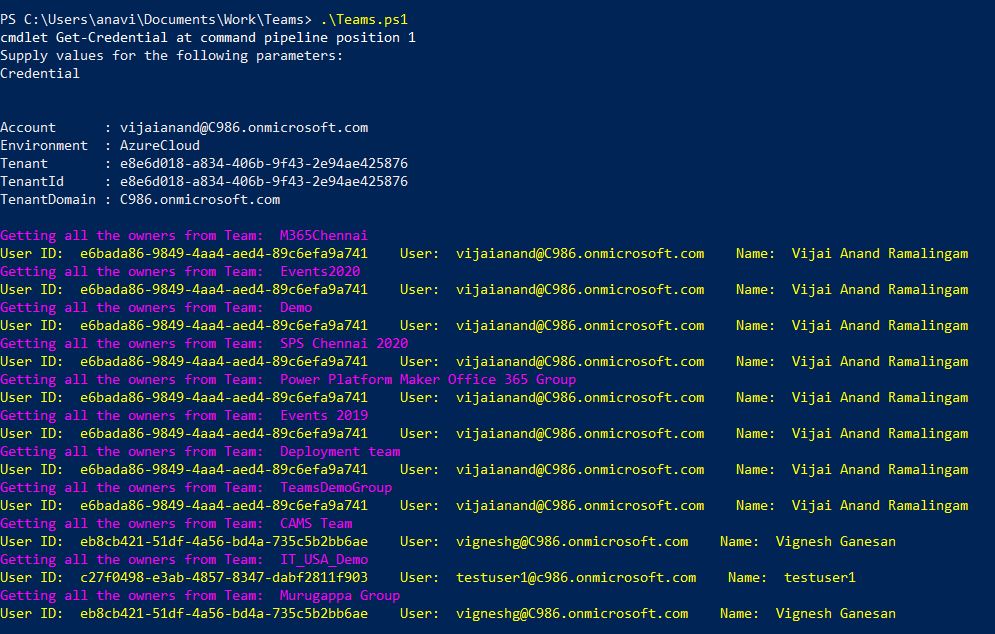 - Write-Host -ForegroundColor Magenta "Getting all the owners from Team: " $team.DisplayName