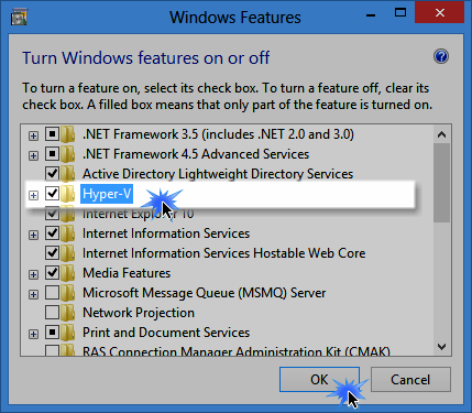 I am going to install it using Offline Installer. Before Installing, Go to Control Panel-> Programs and Features -> Click on Turn Windows features on or off. Install/Turn on Hyper-V. (Check your PC's BIOS and make sure that hardware-assisted virtualization and hardware-assisted data execution protection turned on otherwise you can't start the Windows Phone Emulator)