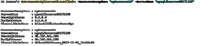 - Get-AzureRmSqlServerFirewallRule -ResourceGroupName "myResourceDB" -ServerName "mysqldbserver20171103"