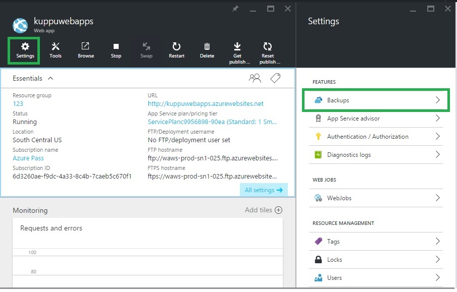 Step 2: In web app's blade, select Settings, then Backups. The Backups blade will be displayed.