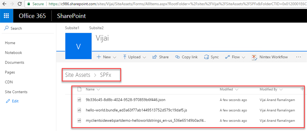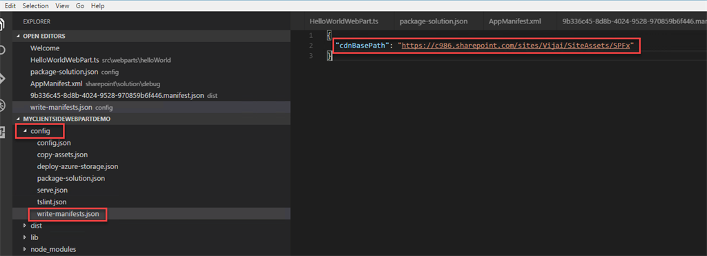 Open write-manifests.json file which is located in Config folder. Update cdnBasePath value with the document library URL which will act as CDN. In my case I have created a folder named SPFx under Site Assets library and update cdnBasePath with that URL as shown below. Save the file.