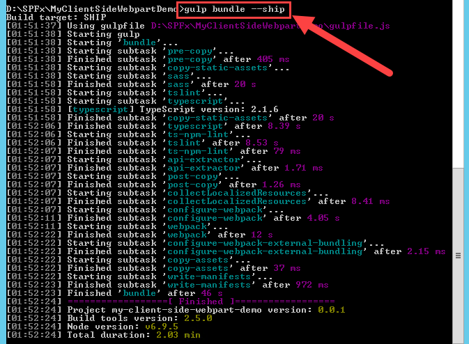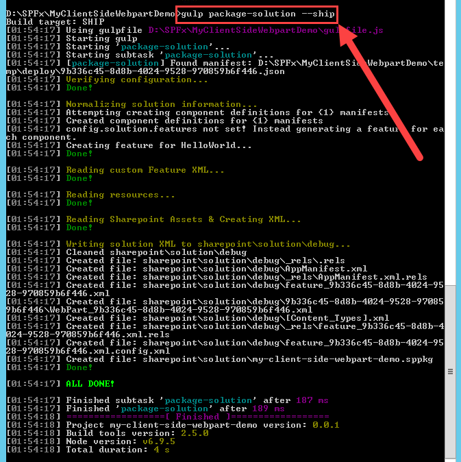 Execution of above command will create a <clientsidewebpart>.sppkg package file to sharepoint/solution folder as shown below.