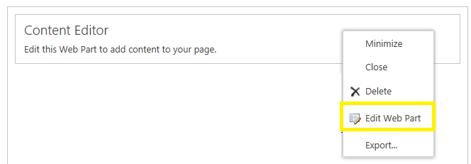 - Click the Content Editor box that just appeared. Select the dropdown in the top right of that box and select Edit Web Part.