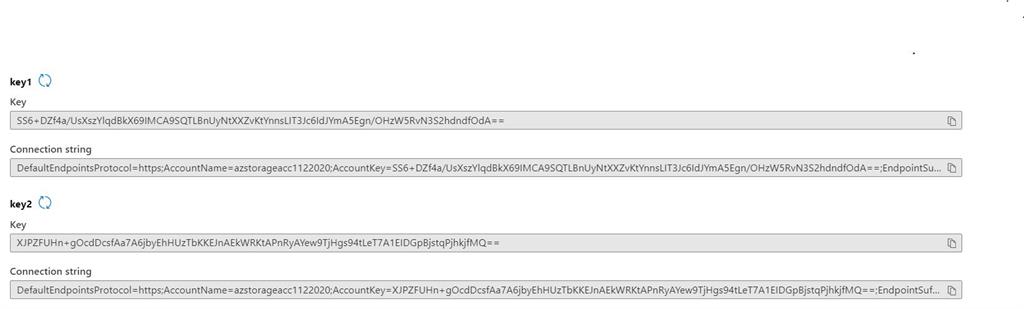 - $storageAccountKey2= (Get-AzStorageAccountKey -ResourceGroupName $resourceGroupName -Name $storageAccountName).Value[1]
