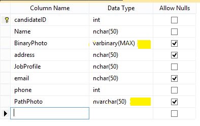 This is the table that is used to store images and details Column BinaryPhoto -Data type Varbinary(max) to store image in database in Byte format and Column PathPhoto – data type nvarchar(50) to store URL/Path of image