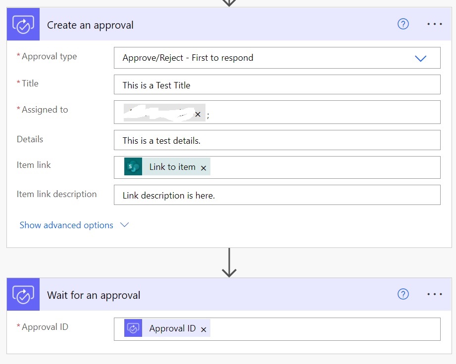 - Next, add the 'Create an approval' action and add the necessary details. I have added it for testing only. Also, add the 'Wait for an approval' action and add the 'Approval ID' in it.