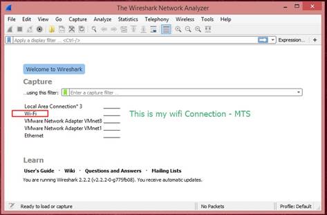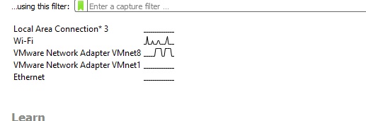 This is what it looks like when you installed it in your system. As you can see, there are numerous interfaces shown in the software, you have to choose your interface. In my case, it is Wi-Fi. You will see a small graph will run while connecting with your interface.