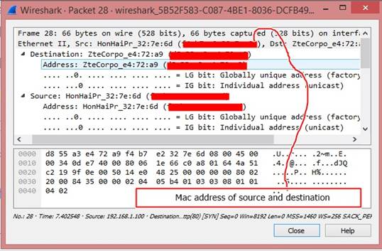 This is the more elaborated view of packet 28, where you can see the Mac address of both source and destination. You also can see the frame size and also the IP address. Other crypt information is stored in hex and ASCII format , which you can analyze with the help of look up table.