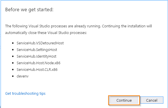 You can see the visual studio processes are already running on my PC and while click continues button for continuing the installation will automatically close these visual studio processes.
