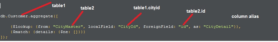 - {$lookup: {from: "CityMaster", localField: "CityId", foreignField: "id", as: "CityDetail"}},